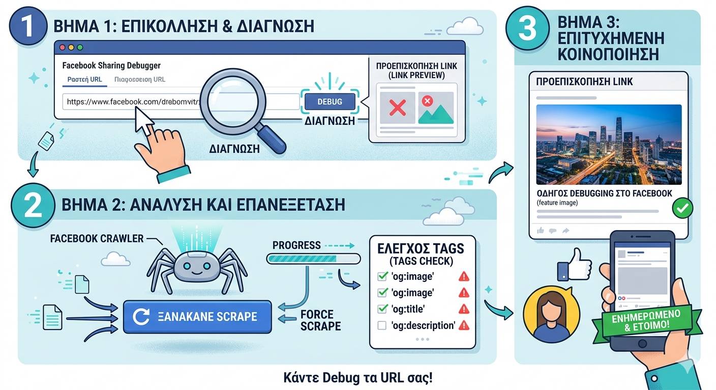 Αν έχετε ανεβάσει ποτέ ένα link στο Facebook και είδατε με απογοήτευση ότι η προεπισκόπηση (preview) δείχνει μια παλιά εικόνα, λάθος τίτλο ή —ακόμα χειρότερα— καθόλου εικόνα, μην ανησυχείτε. Δεν φταίει το site σας, απλώς το Facebook έχει “αποθηκεύσει” (cached) την παλιά πληροφορία.