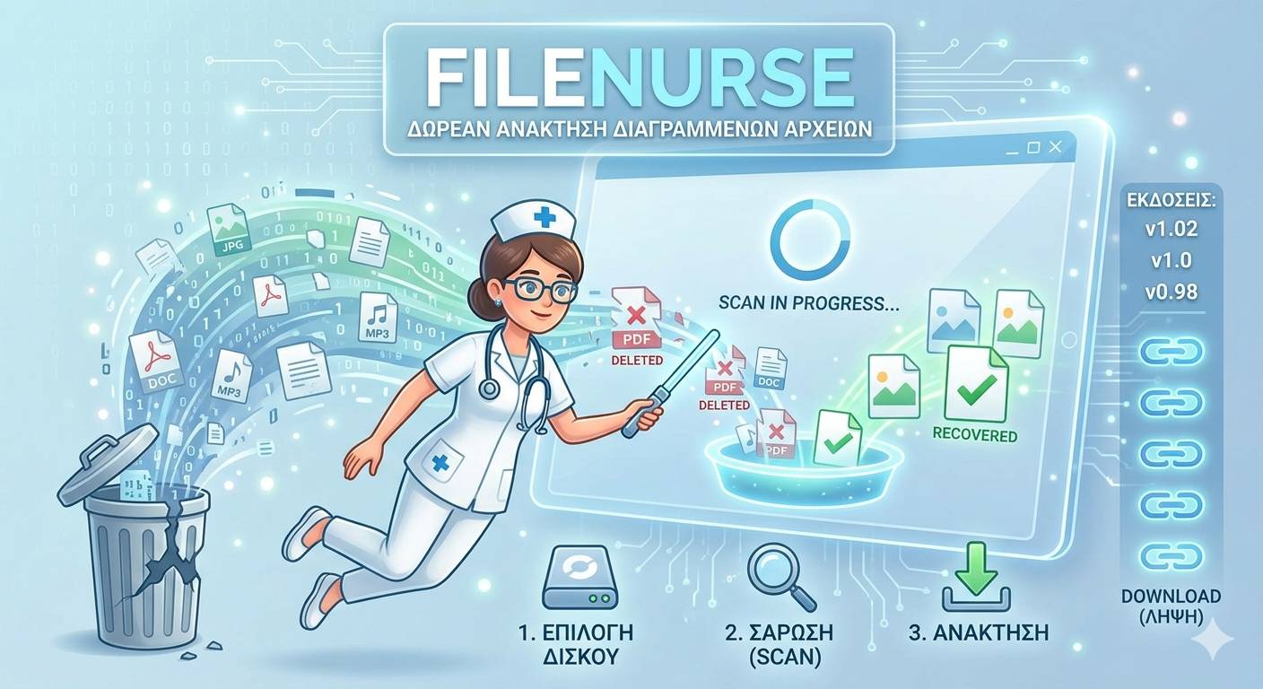 Το FileNurse είναι ένα πρόγραμμα Data Recovery που επιτρέπει την επαναφορά αρχείων που διαγράφηκαν κατά λάθος από τον σκληρό δίσκο, από USB στικάκια ή κάρτες μνήμης (SD), ακόμα και αν έχουν αφαιρεθεί από τον Κάδο Ανακύκλωσης.