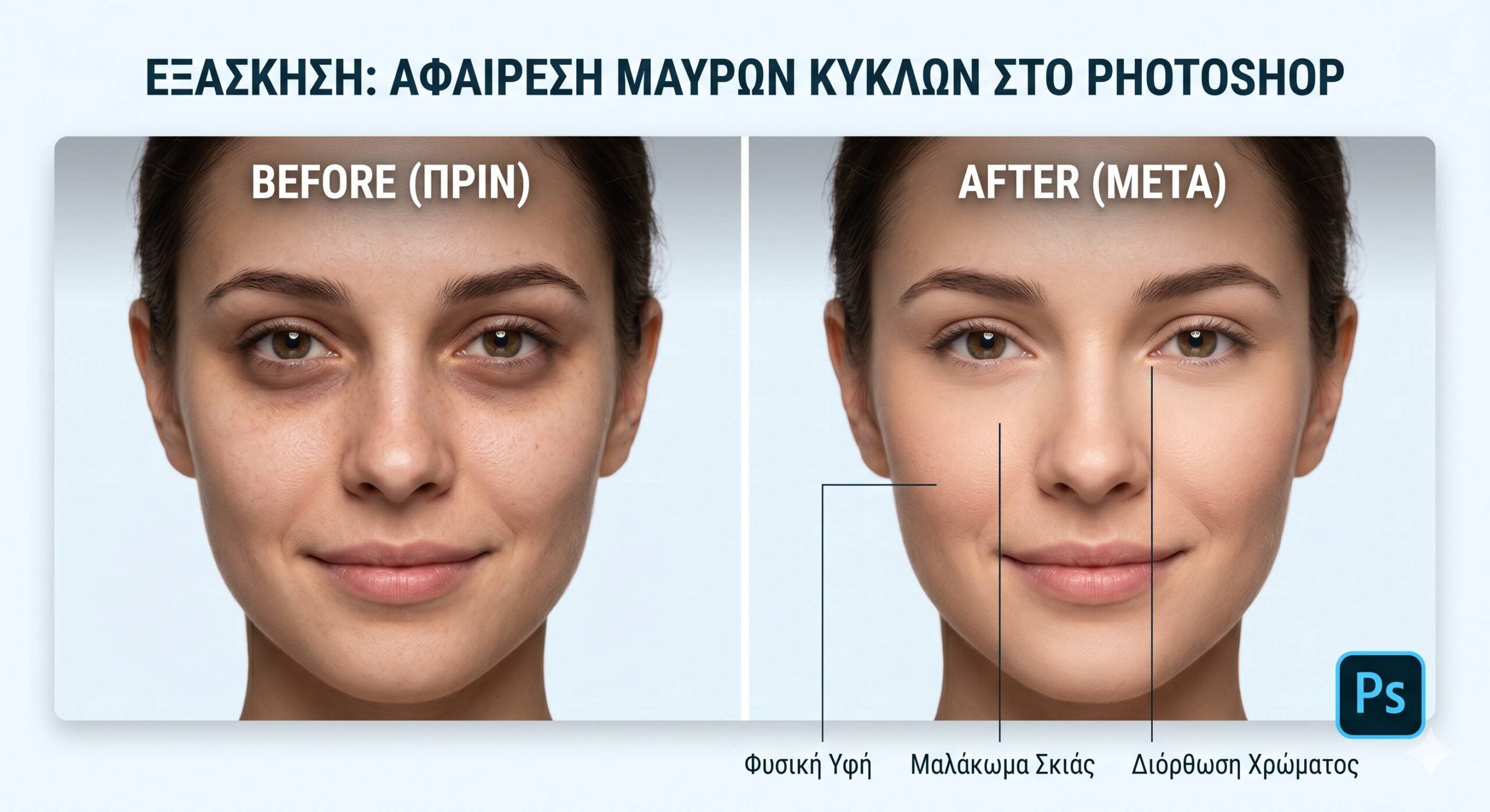 - Color Balance: Συχνά οι μαύροι κύκλοι έχουν μπλε ή μοβ τόνους. Δοκιμάστε να χρησιμοποιήσετε ένα Adjustment Layer (Curves ή Hue/Saturation) για να προσθέσετε λίγο ζεστό χρώμα (κίτρινο/κόκκινο) τοπικά.
