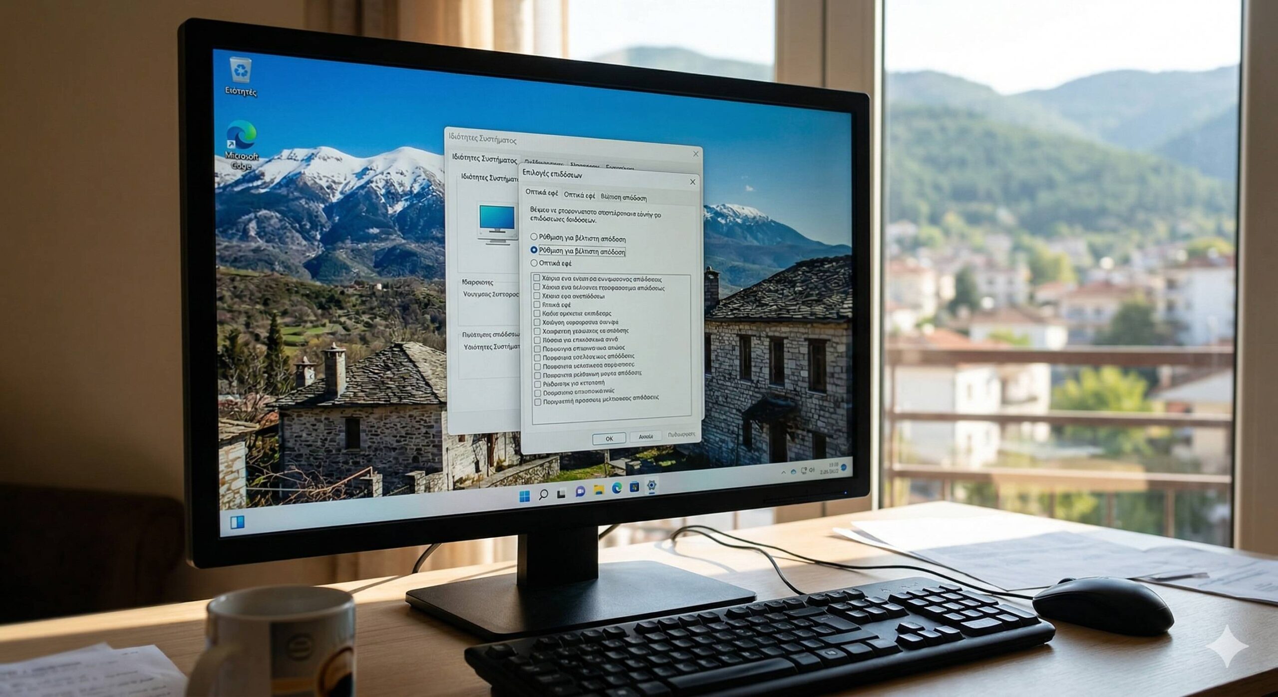 - Ρύθμιση για βέλτιστη απόδοση: Αυτή η επιλογή θα απενεργοποιήσει όλα τα οπτικά εφέ (σκιές, κινήσεις παραθύρων, διαφάνειες). Το PC θα φαίνεται λίγο πιο “ξερό” οπτικά, αλλά θα ανταποκρίνεται πολύ πιο γρήγορα.