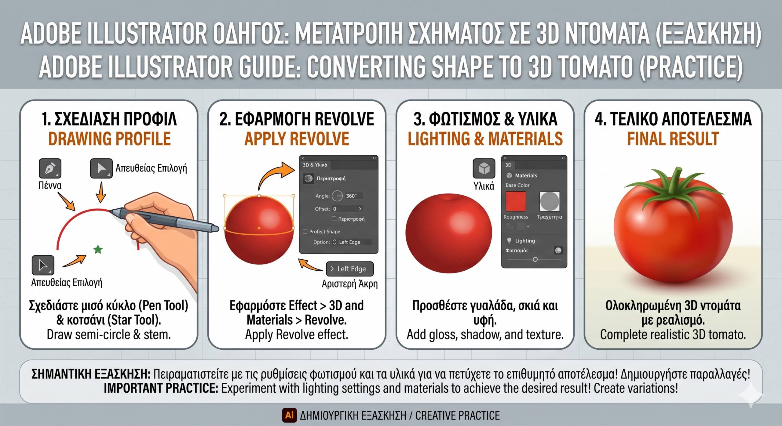 Η δημιουργία μιας τρισδιάστατης ντομάτας στο Adobe Illustrator είναι μια εξαιρετική άσκηση για να μάθετε τα 3D effects. Θα χρησιμοποιήσουμε το εργαλείο Revolve (Περιστροφή), το οποίο μετατρέπει μια επίπεδη γραμμή σε κυκλικό αντικείμενο.