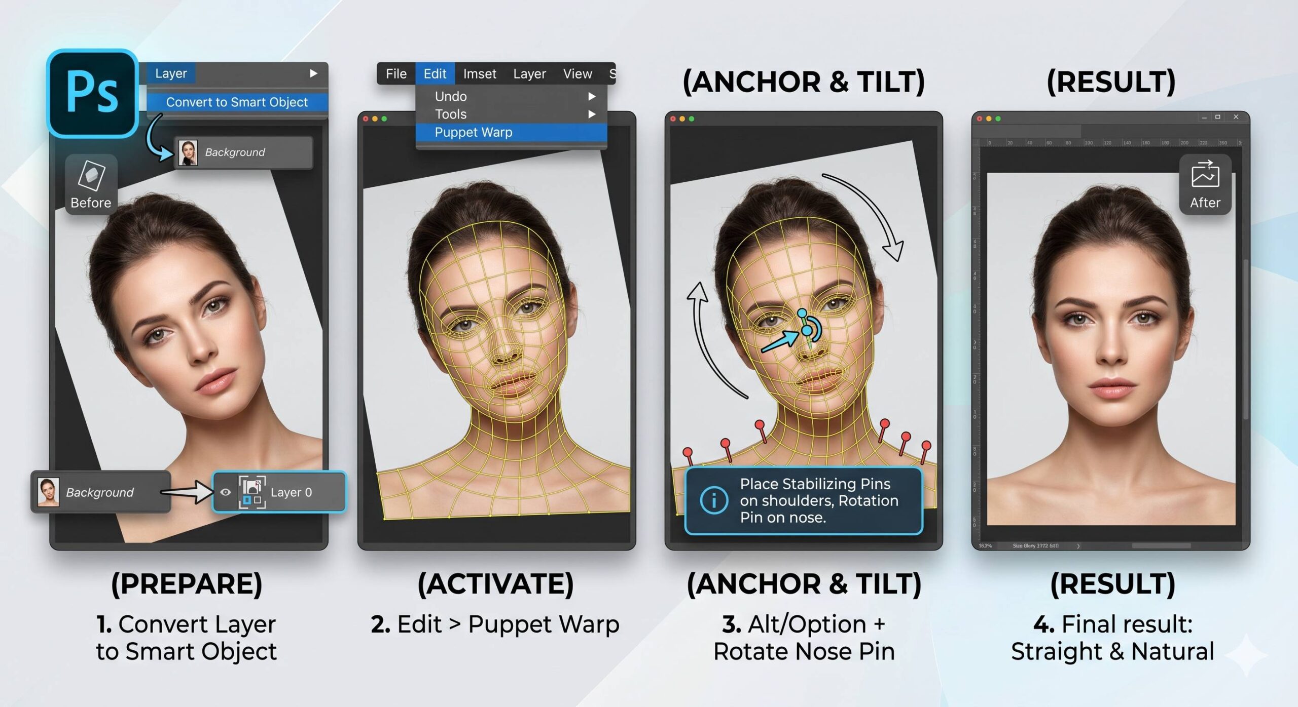 Η ευθυγράμμιση ενός προσώπου ή η διόρθωση της κλίσης του κεφαλιού στο Photoshop μπορεί να γίνει εξαιρετικά γρήγορα με το εργαλείο Puppet Warp. Αυτή η μέθοδος είναι ιδανική γιατί σας επιτρέπει να “περιστρέψετε” το κεφάλι διατηρώντας τη φυσικότητα των χαρακτηριστικών.