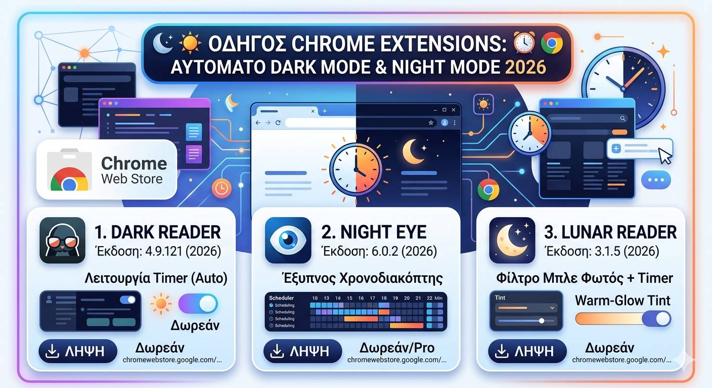 Για το 2026, η διαχείριση της φωτεινότητας στον Chrome έχει γίνει εξαιρετικά εξελιγμένη. Οι κορυφαίες επεκτάσεις πλέον δεν προσφέρουν μόνο “μαύρο φόντο”, αλλά έξυπνο προγραμματισμό (scheduling) που συγχρονίζεται με την ανατολή/δύση ή το σύστημα.